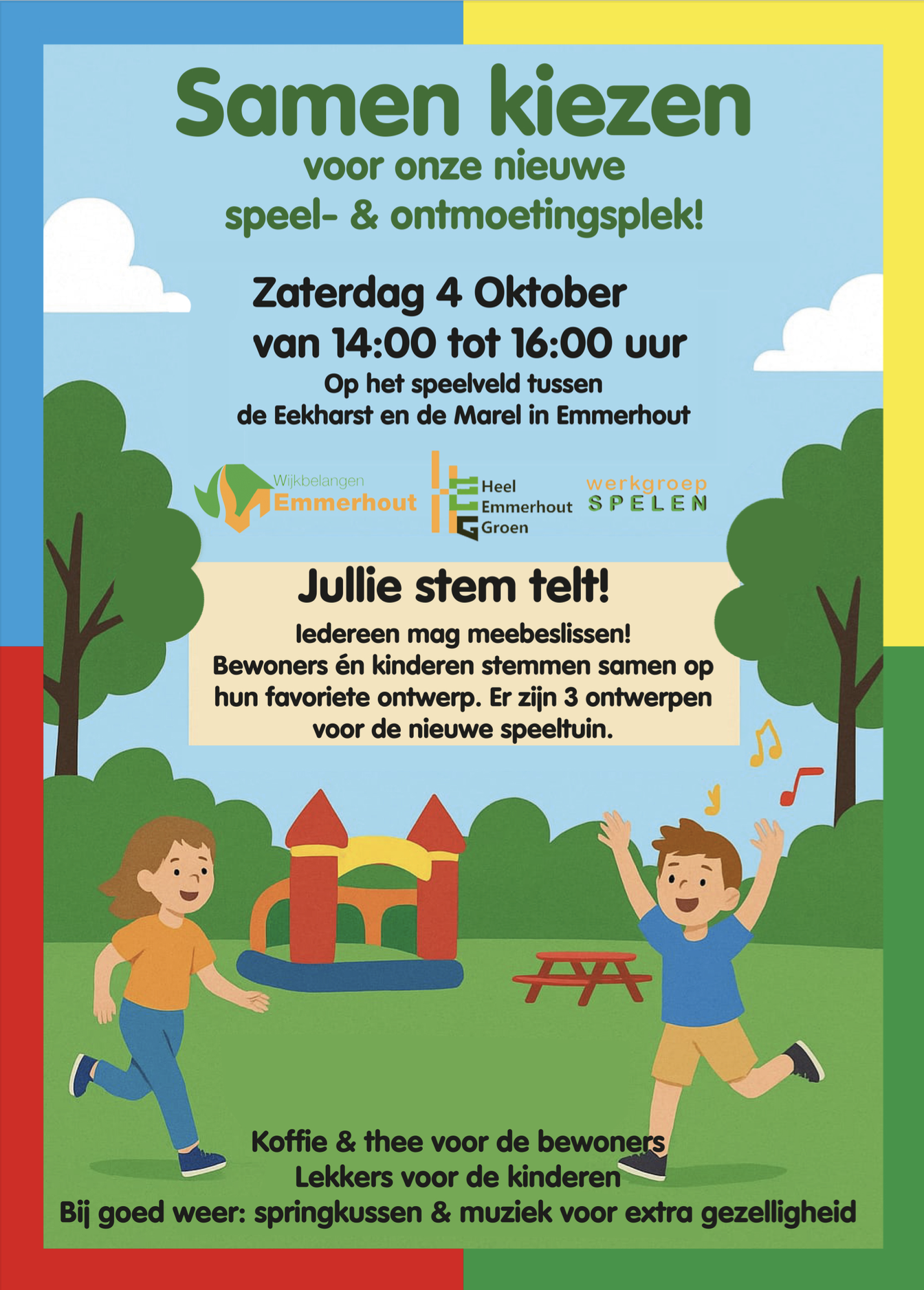 Zaterdagmiddag 4 oktober worden 3 ontwerpen gepresenteerd voor de nieuwe speel- & ontmoetingsplek tussen Laan van de Marel en Laan van de Eekharst. Een aantal speeltoestellen worden geplaatst in een natuurlijke omgeving. Iedereen kan die middag meebeslissen welke ontwerp gekozen wordt. Werkgroep Heel Emmerhout Groen (de HEG) is aanwezig om ideeën te presenteren hoe de groene omgeving eruit zou kunnen gaan zien.