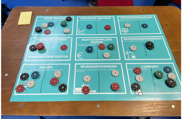 Na de pauze spelen we het scenariospel. Een spel waarin de gespreksdeelnemers de voor- en tegens van de verschillende keuzes tegen elkaar moeten afwegen. Met fiches geven ze aan wat ze belangrijk vinden bij de energietransitie in Emmerhout. Het milieu of keuzevrijheid? Kosten voor de bewoner of kosten voor de samenleving. Comfort in de woning of toch een snelle en probleemloze omschakeling? Uitdagingen en keuzes genoeg.
